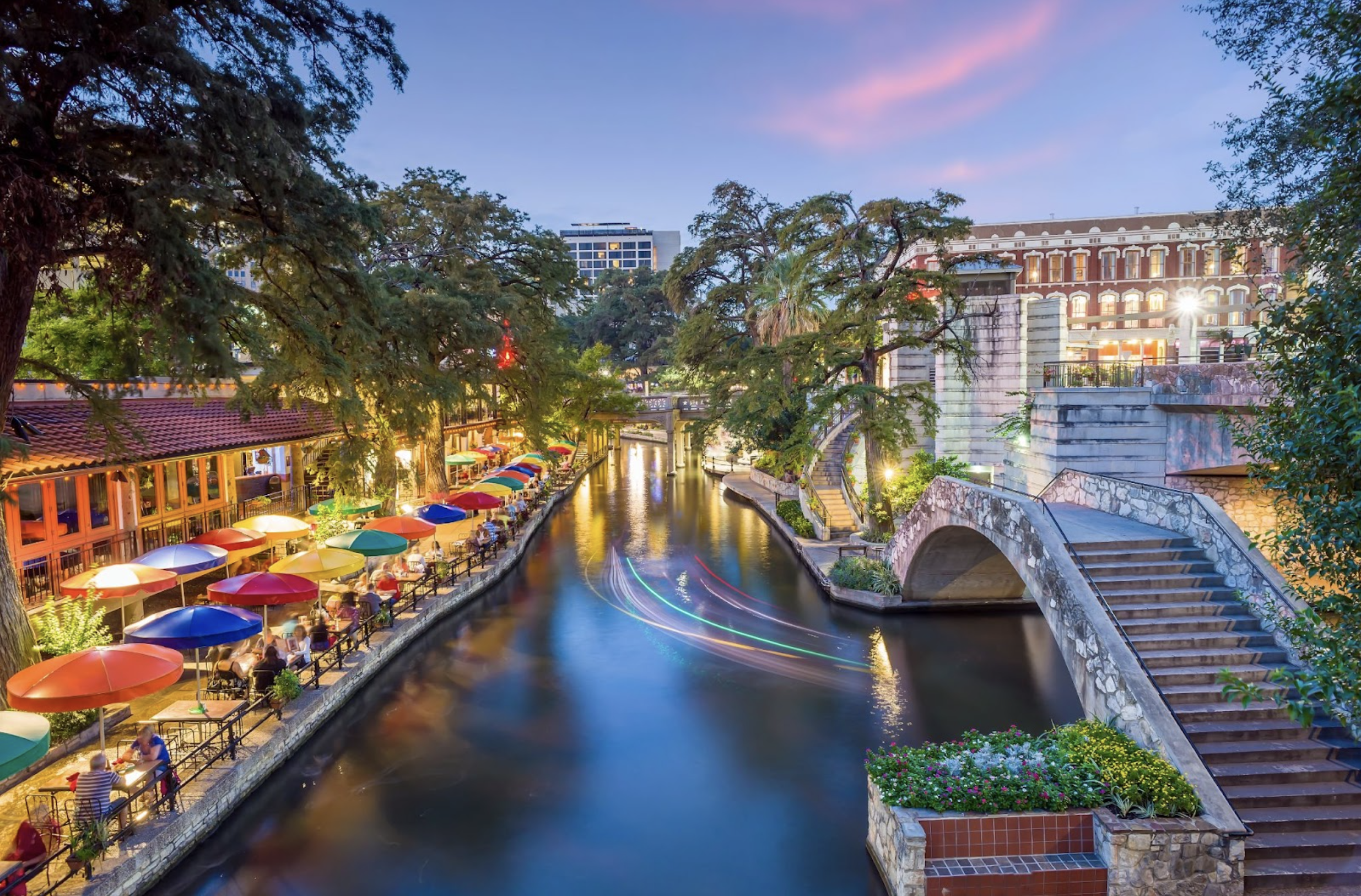 San Antonio River Walk at dusk with colorful restaurant umbrellas, stone bridges, and lights reflecting on the water.